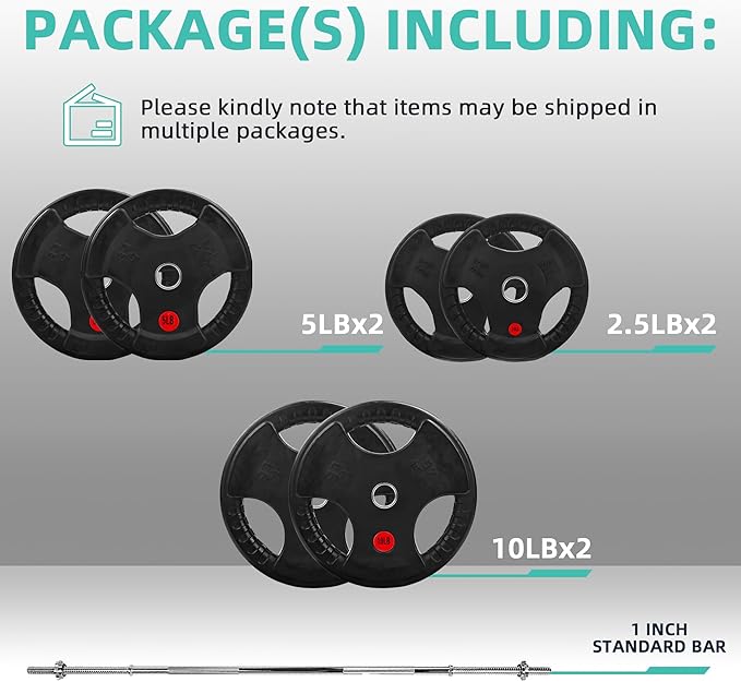 - 45 pounds set: 1x 5 feet Standard Barbell Bar (10 lbs) & Star Locks, 2x 2.5lbs, 2x 5lbs, 2x 10lbs Cast Iron Plates.