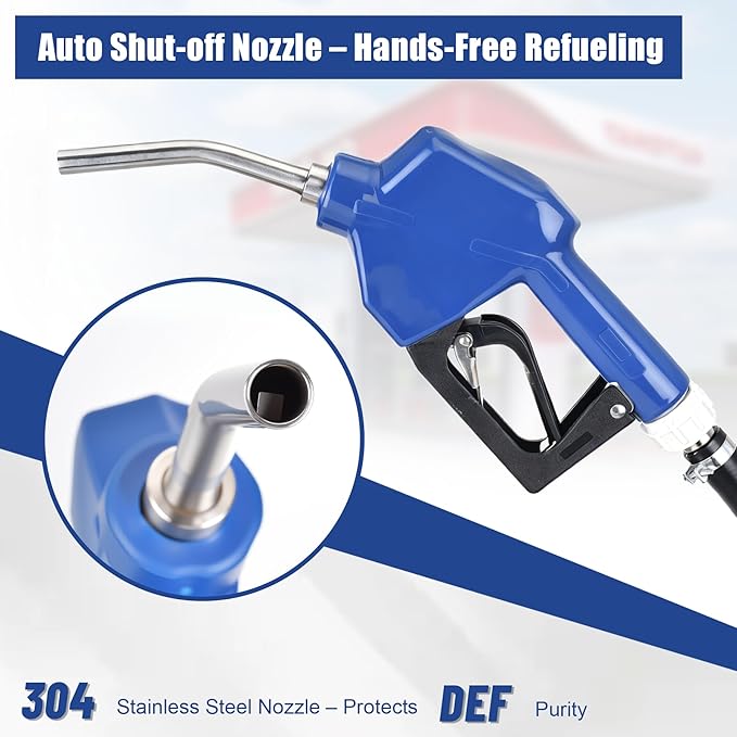 - [Auto Shut-off Stainless Steel Nozzle] Equipped with a 304 stainless steel auto shut-off nozzle for smooth, spill-free refilling. Designed for precise and controlled dispensing to vehicles and equipment.