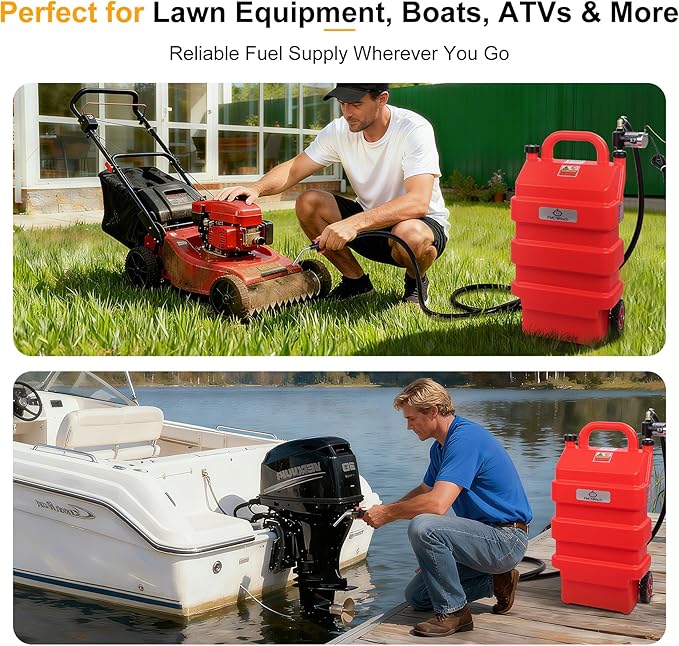 - [16 Gallon Portable Fuel Caddy] Ideal for farms, boats, lawn equipment, garages, and recreational use. The large-capacity design with sturdy wheels makes refueling convenient and efficient anywhere.