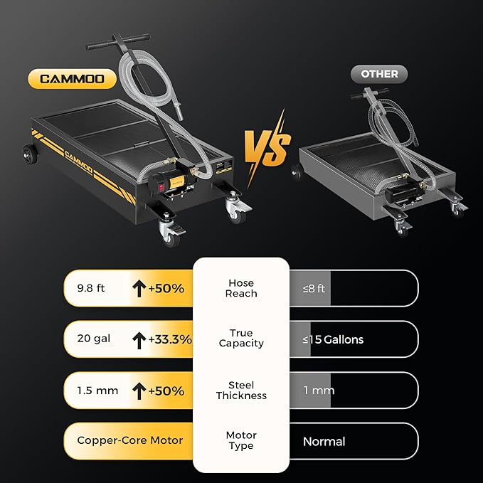 - High Capacity:Oversized 35.4" x 19.7" x 6.7" steel tank delivers a verified 20 gallons and provides a bigger footprint than standard oil drain pans so shop owners, fleet managers, farmers and DIYers can drain a full-size pickup, two RVs or four sedans in one go with less lifting, fewer trips to the recycler and more time for paid jobs. It works with all common waste oils (motor, hydraulic, etc.)—gasoline explicitly excluded.
