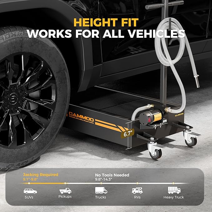 - Heavy-Duty Construction:The electric oil change pan has 1.5 mm carbon-steel walls and is 0.5 mm thicker than standard oil change pans, so it resists daily wear, handles heavy hydraulic loads without warping, and stands up to rough movement in busy shops. It features a precision powder-coat finish that fights corrosion, stays rust-free, and keeps the surface looking sharp. Finely welded seams boost load capacity and eliminate leak risks, and each unit is water-tested before shipment to ensure it is a long-lasting, leak-proof tool for shops, fleets, and DIYers.