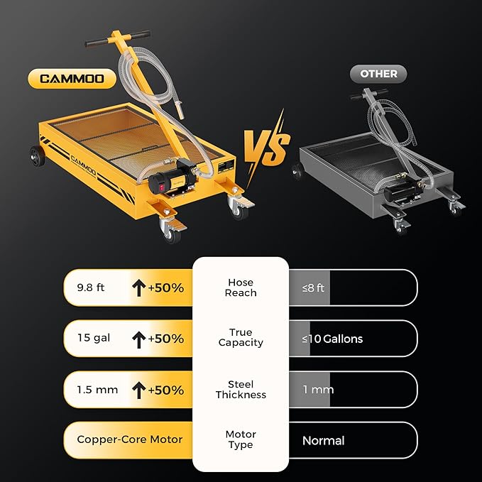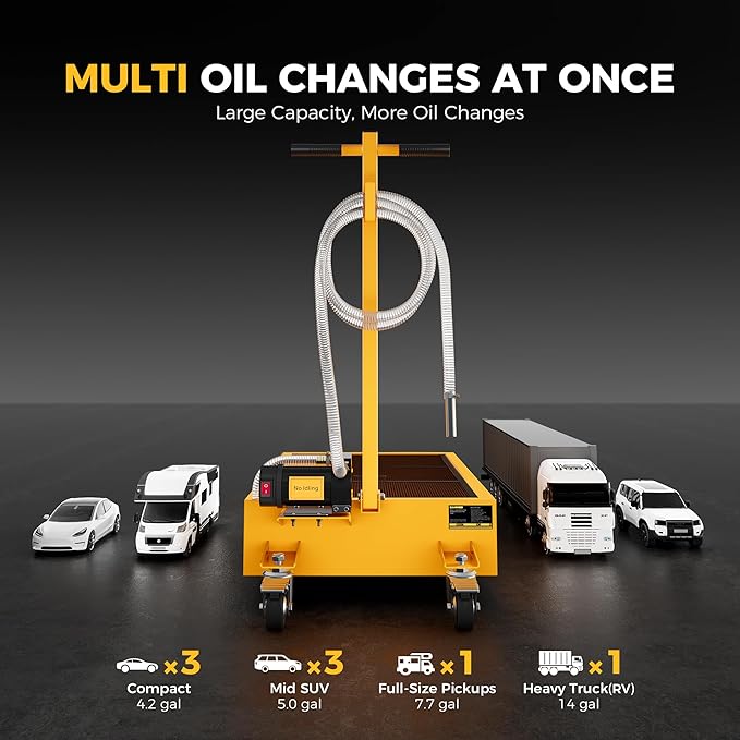 - High Capacity:Oversized 31.5" x 19.7" x 5.7"Steel tank delivers a verified 15 gallons and provides a bigger footprint than standard oil drain pans so shop owners, fleet managers, farmers and DIYers can drain a full-size pickup, two RVs or four sedans in one go with less lifting, fewer trips to the recycler and more time for paid jobs. It works with all common waste oils (motor, hydraulic, etc.)—gasoline explicitly excluded.