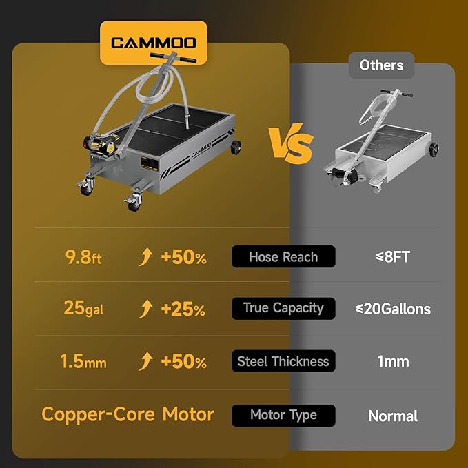 - High Capacity:Oversized 39.76" x 23.23" x 8.5" steel tank delivers a verified 25 gallons and provides a bigger footprint than standard oil drain pans so shop owners, fleet managers, farmers and DIYers can drain a full-size pickup, two RVs or four sedans in one go with less lifting, fewer trips to the recycler and more time for paid jobs. It works with all common waste oils (motor, hydraulic, etc.)—gasoline explicitly excluded.