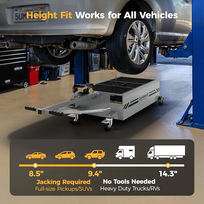 - Heavy-Duty Construction:The electric oil change pan has 1.5 mm carbon-steel walls and is 0.5 mm thicker than standard oil change pans, so it resists daily wear, handles heavy hydraulic loads without warping, and stands up to rough movement in busy shops. It features a precision powder-coat finish that fights corrosion, stays rust-free, and keeps the surface looking sharp. Finely welded seams boost load capacity and eliminate leak risks, and each unit is water-tested before shipment to ensure it is a long-lasting, leak-proof tool for shops, fleets, and DIYers.