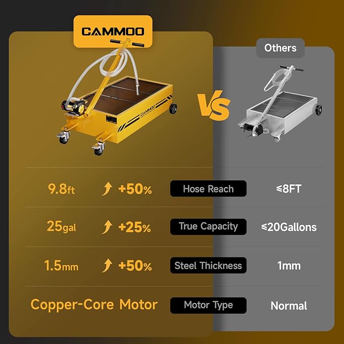 - High Capacity:Oversized 39.76" x 23.23" x 8.5" steel tank delivers a verified 25 gallons and provides a bigger footprint than standard oil drain pans so shop owners, fleet managers, farmers and DIYers can drain a full-size pickup, two RVs or four sedans in one go with less lifting, fewer trips to the recycler and more time for paid jobs. It works with all common waste oils (motor, hydraulic, etc.)—gasoline explicitly excluded.