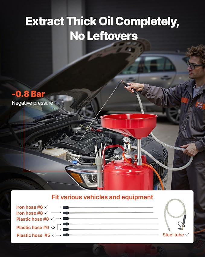 - Leak-proof Design: The 16.5-inch wide splash-proof funnel and 59.1-inch long high-flow PVC hose of the oil drain container avoid spills and leaks, keeping your workspace clean and reducing cleanup time