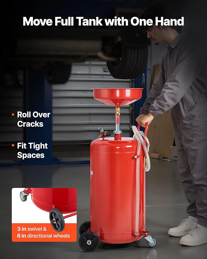- Easy Mobility: Equipped with 6-inch directional wheels and 3-inch swivel casters, this portable oil drainer moves smoothly across various surfaces, ensuring hassle-free mobility in both tight and spacious environments
