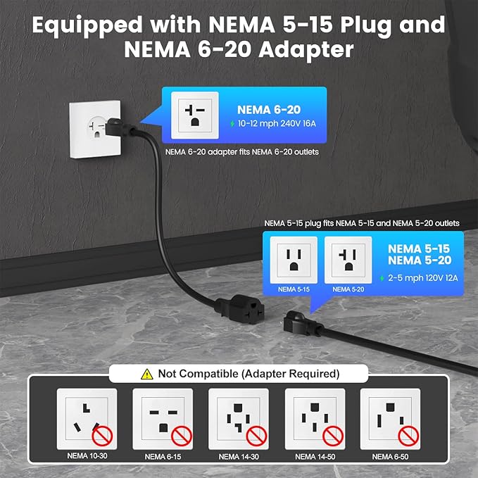 - Level 1 & Level 2 EV Charger--- This portable level 1 ev charger is equipped with NEMA 5-15 plug(Level 1 circuits, 120V, 12A, 2-5 mph)and attached a NEMA 6-20 adapter(Level 2 circuits, 240V, 16A, 10-12 mph). It's not compatible with NEMA 6-15/10-30/14-30/14-50/6-50 outlets – you'll need a NEMA 14-50/14-30/10-30/6-50 to 5-15 adapter (sold separately) to connect