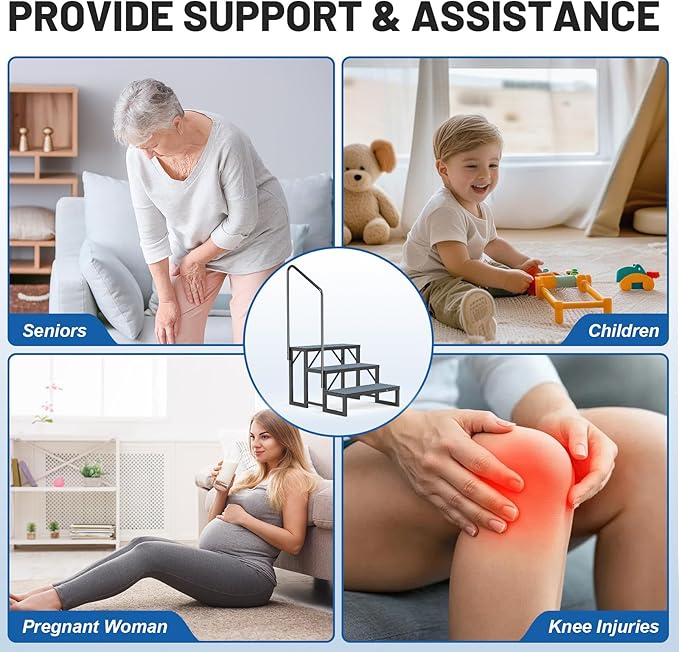 - PORTABLE HANDRAIL & NON-SLIP MAT: RV steps with handrail can provide extra support and safety for your family, non-slip mats that add friction reducing the risk of falls and injuries and ensuring that you and your family can access your caravan or camping trailer safely and easily.