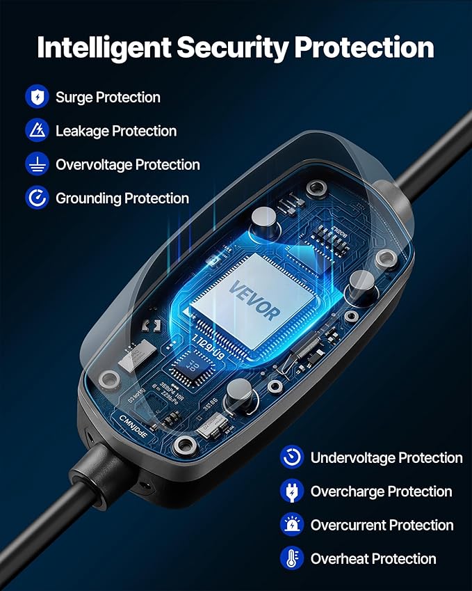 - Charge Securely Every Time: Equipped with an intelligent chip, this portable EV charger provides complete protection from surge, leakage, grounding, overvoltage, undervoltage, overcurrent, overheating, and overcharging