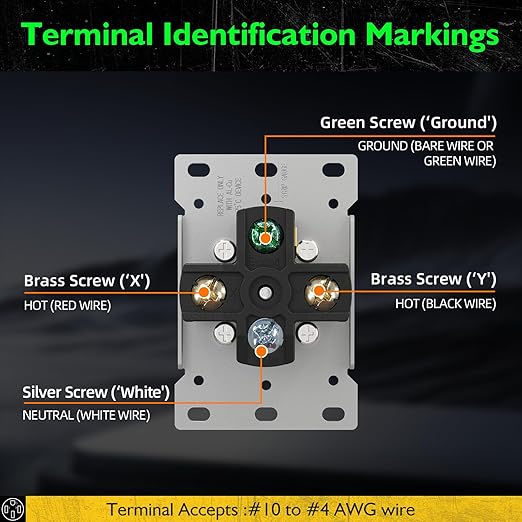- đ ď¸ ăQuick & Hassle-Free InstallationăOur NEMA 14-50R outlet is designed for a seamless setup. It features a universal flush mount design that fits standard single or double gang boxes, and the clearly marked terminals (LINE, NEUTRAL, GROUND) allow for effortless wiring. Simply pair it with any standard wall plate (2.15" center hole), and you'll have your 50 amp outlet for your EV charger, RV, or dryer ready in no time.Terminal Accepts #10, #8 to #4 AWG. Receptacles will accept copper or aluminum wire.