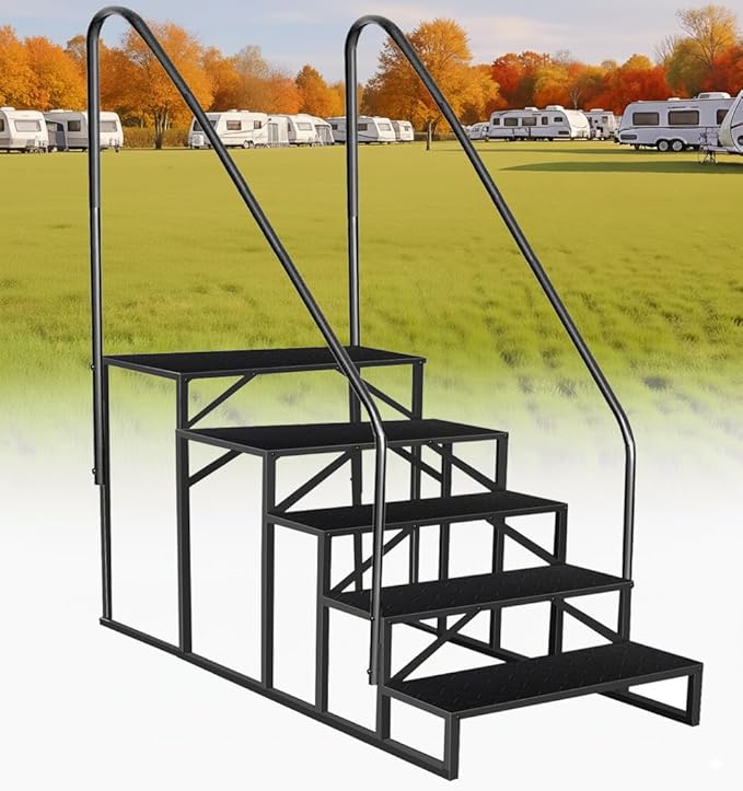 - โ ๐๐ฉ๐ ๐ซ๐๐๐๐ ๐๐ ๐๐ญ๐๐ฉ๐ฌ: To further improve safety when moving up and down your RV steps, weโve widened and thickened the step platform and added non-slip granules to reduce the risk of slipping. The RV steps with handrail use 2 mm thick plate material for the main body, and the top stepโs effective width is expanded to 15 inches, creating a larger landing area that provides more comfortable, secure footing.