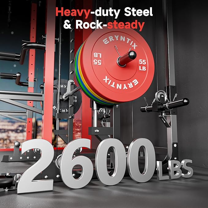 - π»2600LBS Capacity Heavy-Duty Steel---Built with 2"x2" Q235 carbon steel and reinforced joints, supports up to 2600 lbs. Linear bearing system ensures ultra-smooth barbell movement and rock-solid stability for heavy lifts. Compact footprint ideal for home or garage gyms.