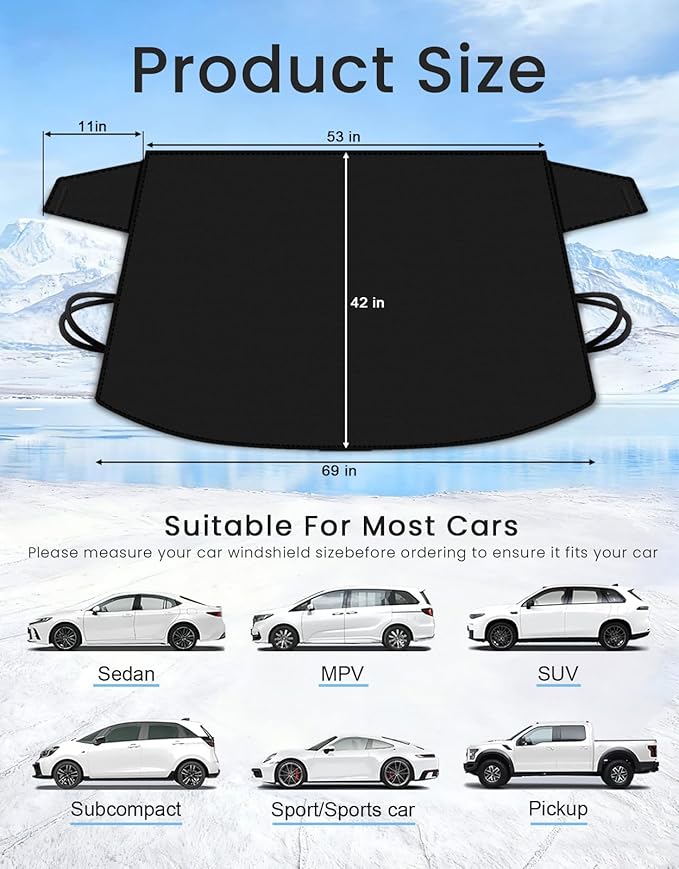 - 【Universal Fit for Most Vehicles】Our windshield cover for ice and snow (also a versatile car cover) is engineered to fully cover your entire windshield. As a premium car windshield cover for ice and snow, it fits all types of vehicles—Cars, SUVs, Trucks, Vans, RVs, and Campers—making it an essential addition to your automotive exterior accessories.