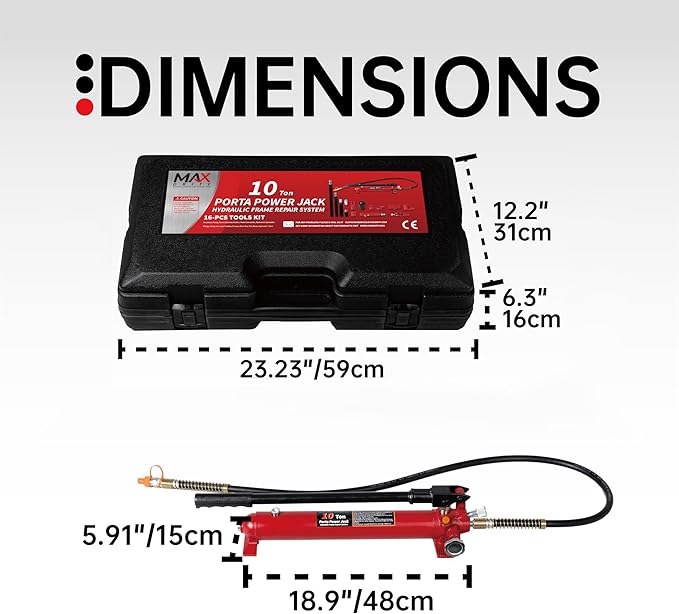 - Powerful Hydraulic Performance: With an impressive 10 tons (20000 lbs) of hydraulic force, this porta power kit is engineered to handle demanding auto body and frame repair tasks with ease. Whether you're lifting, pushing, pulling, spreading, or straightening, this system provides the heavy-duty power needed for accurate and efficient results.