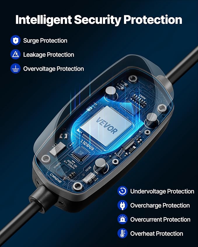 - Charge Securely Every Time: Equipped with an intelligent chip, this portable EV charger provides complete protection from surge, leakage, grounding, overvoltage, undervoltage, overcurrent, overheating, and overcharging
