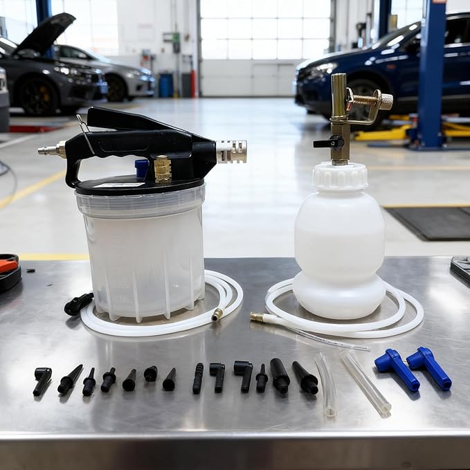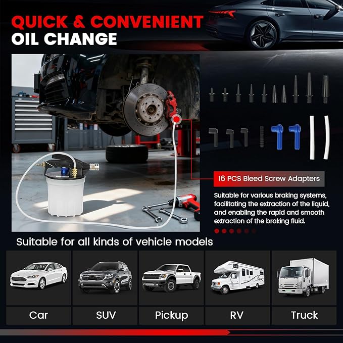 - One-Person Operation – No Helper Needed! This brake bleeder kit (2.1Qt (2L) reservoir + 1Qt (1L) refill) uses vacuum power; auto refill stops mid-job shortages—saves DIYers time.