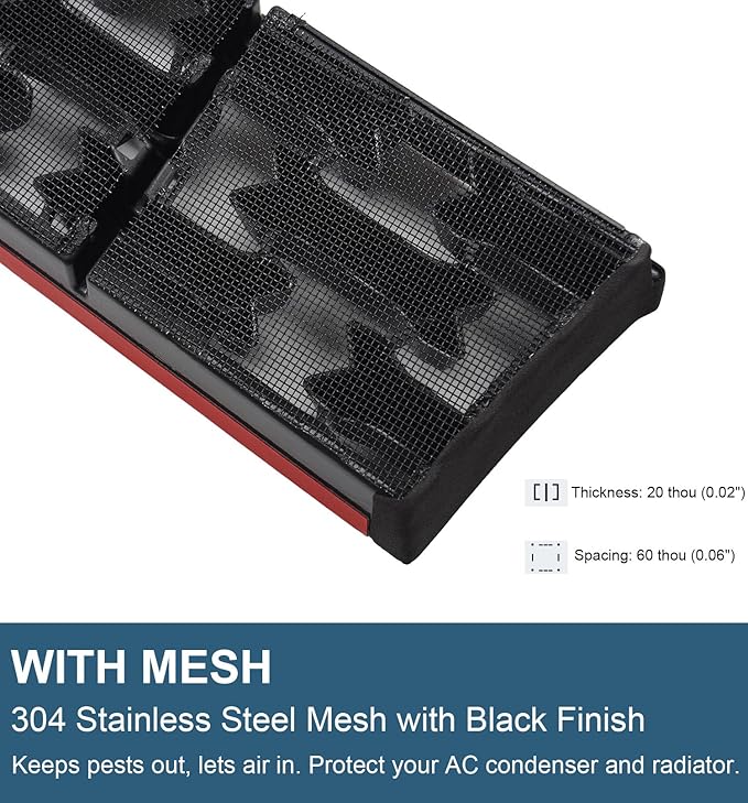 - Max Protection: The grille includes a protective backing of 304 Stainless Steel Mesh (0.02 inch / 20 thou thick with 0.06 inch / 60 thou spacing), effectively blocking even tiny debris, sand, and insects from entering, providing comprehensive protection for your radiator and condenser.
