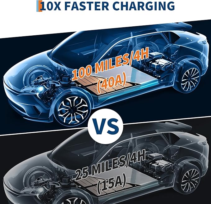 - Dual-Level Fast Charging- The ev charger level 2 supports Level 2(240V/NEMA 14-50) charging. Delivers 40A output for 40% faster charging (100 miles in 4 hours) compared to standard 15A chargers. Industrial-grade plug ensures stable high-power performance.