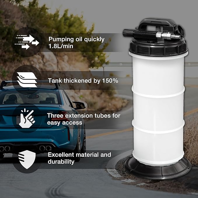 - Zero Fluid Waste: Fluid extractor is equipped with tubes of different diameters that can reach the bottom of the oil pan. With a 6L large-capacity reservoir and 5mm/6mm/8mm dimension tubes, it can thoroughly suck every drop of fluid, applicable to engine oil, brake fluid and other automotive fluids.