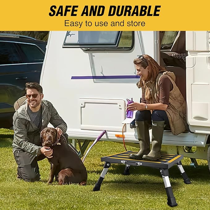 - STRONGER & DURABLE: The heavy duty step stool are made of high-strength aluminum alloy material to ensure sturdiness, durability and long service life. With a weight capacity of up to 500 pounds, the rv steps with platform can withstand frequent use and harsh outdoor conditions, making it an excellent investment for any RV owner