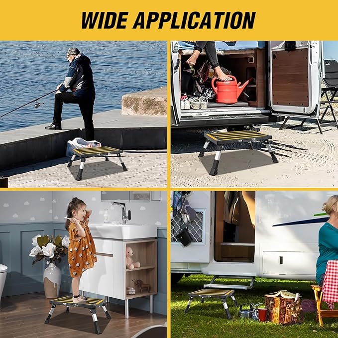 - MULTIPURPOSE:Sturdy foldable step is not only great for getting in and out of your RV but it can also be widely used in camping, truck, library, kitchen, bed, office and retail store