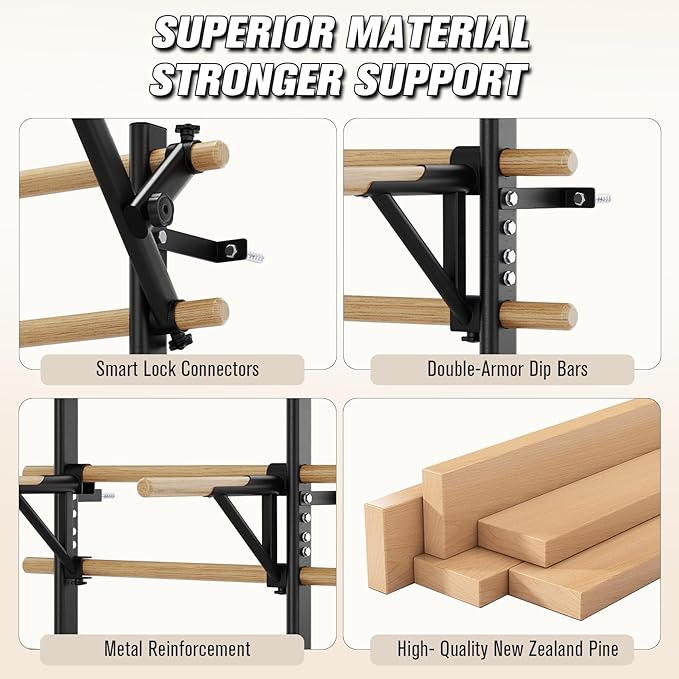 - CUSTOMIZABLE TRAINING HEIGHTS: Maximize your workout versatility with the adjustable pull-up bar and dip attachments, easily reposition it across different rung levels in seconds to customize your training. Set it higher for pull-ups, chin-ups, or hanging core exercises, or lower it for assisted movements and mobility drills. This modular system seamlessly adapts to your fitness goals, supporting everything from intense strength-building to active recovery.