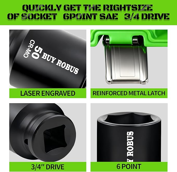 - 3/4" Impact Socket Set: BUYROBUS 3/4" Drive Impact Socket Set Includes 22 sockets, Metric: 19mm, 21mm, 22mm, 24mm, 26mm, 27mm, 29mm, 29mm, 30mm, 32mm, 33mm, 34mm, 35mm, 36mm, 38mm, 41mm, 46mm, 50mm Quick Release Ratchet Handle 18''(24 Tooth), 1PC 3/4'' Sliding T Head Breaker Bar 18'' ,2 Pcs Extension Bar (6'',10''),1 x Storage Case