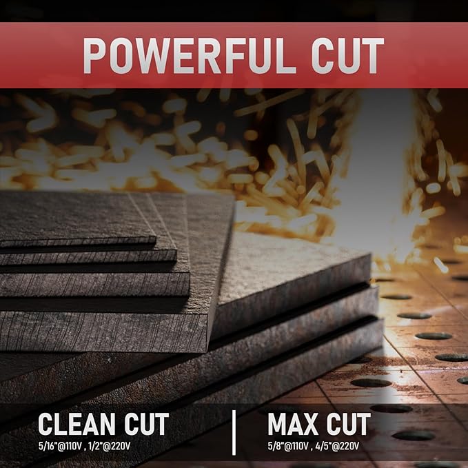 - POWERFUL CUTTING CAPACITY: Harness a robust 55A high current to tackle your toughest jobs with depth and precision. Ideal Clean Cut: 5/16"@110V, 1/2"@220V, Maximum Cut: 5/8"@110V, 4/5"@220V. At the heart of this power is an advanced international MCU intelligent control system, guaranteeing exceptional accuracy and superior cut quality on every project. Regardless of whether the input voltage is 110V or 220V, maintain the air pressure within 45-75 Psi. Failure to do so may adversely affect cutting performance. Note: Requires external air compressor (sold separately).