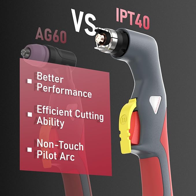 - NON-TOUCH PILOT ARC: The advanced IPT40 torch with non-contact pilot arc technology revolutionizes your workflow. Simply ignite the arc and cut—no need to touch the metal surface. This not only delivers cleaner cuts on rough, painted, or rusty materials but also significantly extends the life of your consumables by preventing tip damage.
