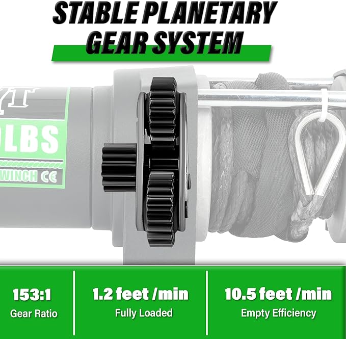 - 【Precision Gears】ATV winch with three-stage planetary gear system,the transmission ratio is 153:1, which not only provides greater torque for the winch, but also saves the size of the gearbox, while significantly improving working accuracy and ensuring the smooth operation of the electric winch during work.