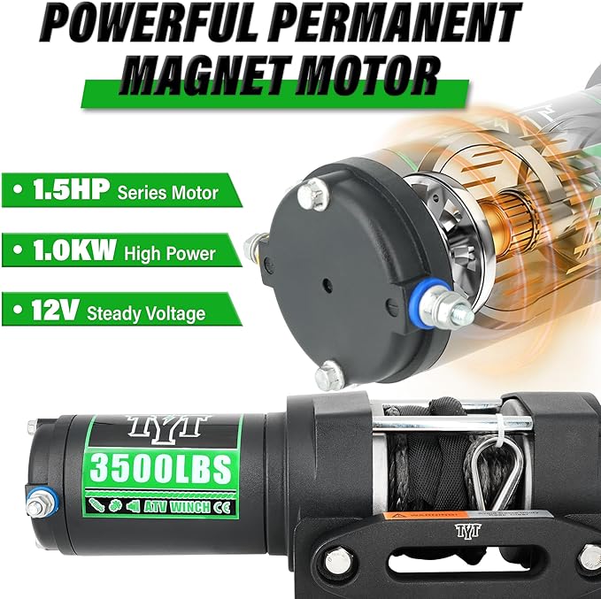 - 【High quality motor】The newly upgraded 1.5HP pure copper permanent magnet motor has excellent high temperature resistance and strong power, and can provide the rope with a pulling force of up to 3500lb. In addition, the minimum cold starting current of this winch is 10A. This motor not only improves work efficiency, but also brings better controllability, allowing you to operate with ease in various applications.