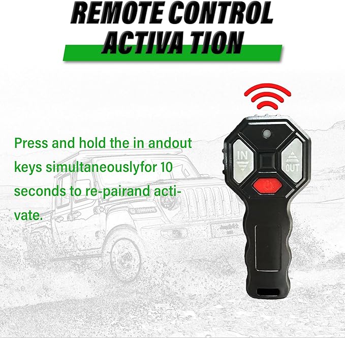 - 【Efficient Control】The ATV winch kits includes a 50-foot wireless remote control and a 10-foot wired controller, and the winch’s receiver responds quickly, ensuring that the winch responds quickly when you operate anywhere within a 50-foot radius.For initial setup, simply pair by holding down the"in" and "out" buttons simultaneously near thewinch for 10 seconds.