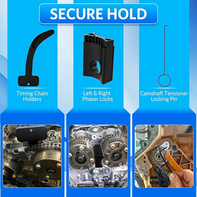 - [Professional-Grade Timing Tool Set]: The HTOMT 3.6 Pentastar timing tool kit comes with 1 x Camshaft Tensioner Locking Pin, 3 x Timing Chain Holders, 2 x Phaser Locks, 1 x Portable Case, 1 pair x Gloves,This kit securely fastens each component, ensuring that all parts remain firmly in place during maintenance of the vehicle's timing system.