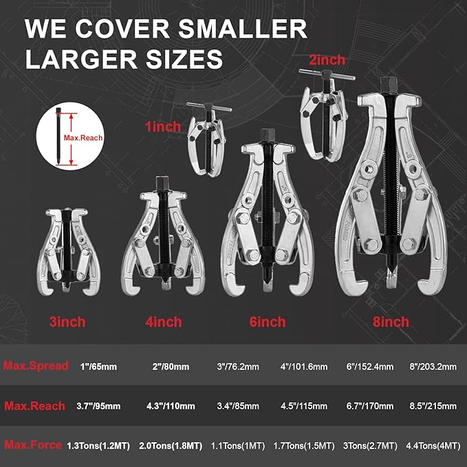 - 【Complete 6-Piece Set for 1"-8" Applications】: Cover small bearings to large flywheels with six pullers (1/2/3/4/6/8 inch) featuring max force from 1.1 to 4.4 tons Reversible jaws and dual-hole design enable flexible internal or external pulling in tight spaces