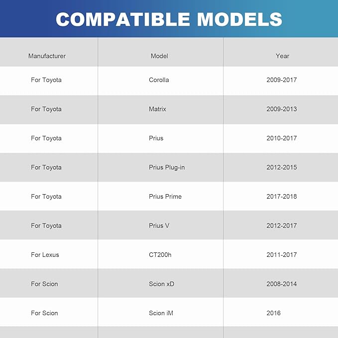 - WIDE APPLICATION: The 6-slot oil filter wrench is compatible with 2009-2017 Corolla, 2009-2013 Matrix, 2010-2017 Prius, 2012-2015 Prius Plug-in, 2012-2017 Prius V, 2017-2018 Prius Prime, 2011-2017 Lexus CT200h, 2016 Scion iM and 2008-2014 Scion xD. It is the preferred choice for DIY oil changes and professional mechanics working on Toyota vehicles.