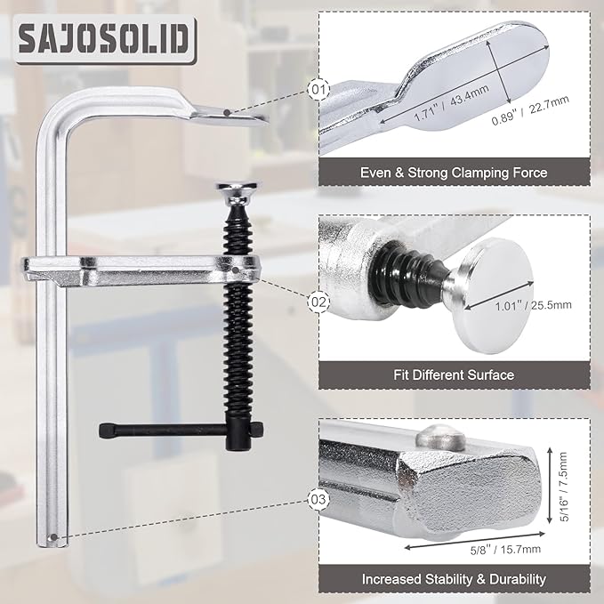 - Carefully Engineered: Professionally Designed F Clamps Features an Integrated Rotating Pad that Automatically Adjusts Its Contact Angle to Match the Curvature of the Workpiece Surface, Enhancing the Pad's Grip and Fit Against the Workpiece