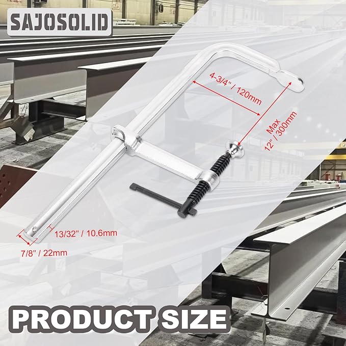 - Basic Dimensions: SajoSolid Heavy-Duty F Clamps, Made of Premium Steel, Includes 4 Pack of Drop-Forged Welding Clamps, Throat Depth: 4-3/4 Inch, Max Load Limit: 880 Lbs, Max Opening Capacity: 12 Inch