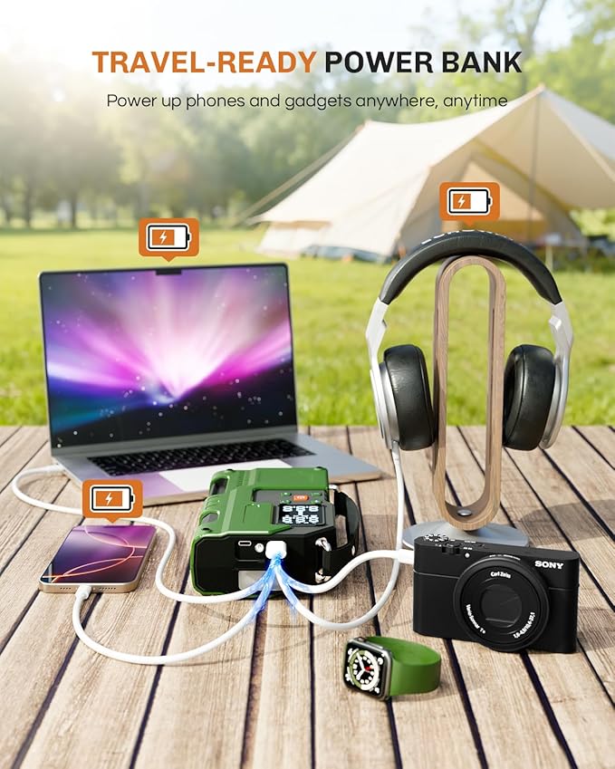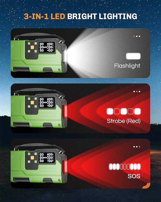 - ➤【6-in-1 Multifunction Jump Starter Power Bank】More than just a car battery booster, this device combines 6 essential functions in one compact unit—jump starter, tire inflator, power bank, 12V DC power source, LED flashlight, and SOS strobe light. Equipped with USB-A and Type-C output ports, it efficiently charges smartphones, tablets, and other devices. One full charge can handle up to 88 tire inflations or multiple full phone recharges—ideal for home use or outdoor emergencies.