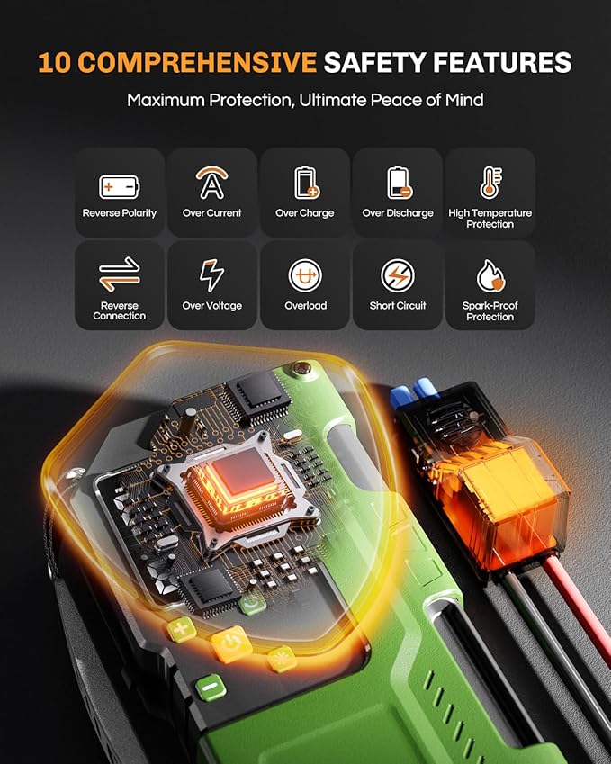 - ➤【Advanced Cooling System & 10 Safety Protections】The WELLUCK car jump starter with air compressor adopts an upgraded honeycomb heat dissipation design, improving heat efficiency by 40% and extending lifespan by 60%. Built-in 10-layer smart protection safeguards against reverse polarity, overcurrent, short circuit, overcharge, and high-temperature damage—ensuring safe and stable performance in any situation.