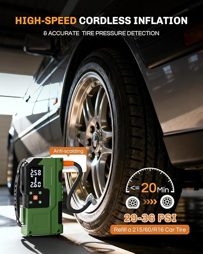 - ➤【Built-in Tire Inflator with Smart Presets & Auto Stop】This jump starter with air compressor features 5 inflation modes, 4 pressure units (PSI, KPA, BAR, KG/CM²), and 4 nozzles for versatile use on car tires, motorcycles, bicycles, and sports balls. With a turbo airflow rate of 45L/min, it inflates a 25 PSI tire in only 2 minutes. The smart preset and automatic shut-off system prevents overinflation, ensuring safe and accurate air pressure every time.