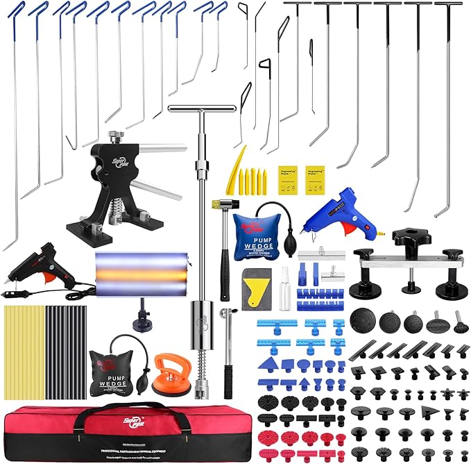 - Guaranteed Paint Protection: Experience a revolution in pull strength with our upgraded system. This professional dent puller kit features heavy-duty glue guns and sticks that are perfectly compatible with the latest puller tabs, creating an ultra-strong bond for a secure and powerful pull every time. Furthermore, we include a professional finishing hammer to expertly address any minor high spots caused by over-stretching during the repair. A few gentle taps effortlessly restore the panel to its original contour, ensuring a flawless finish and guaranteed paint protection for perfect results.