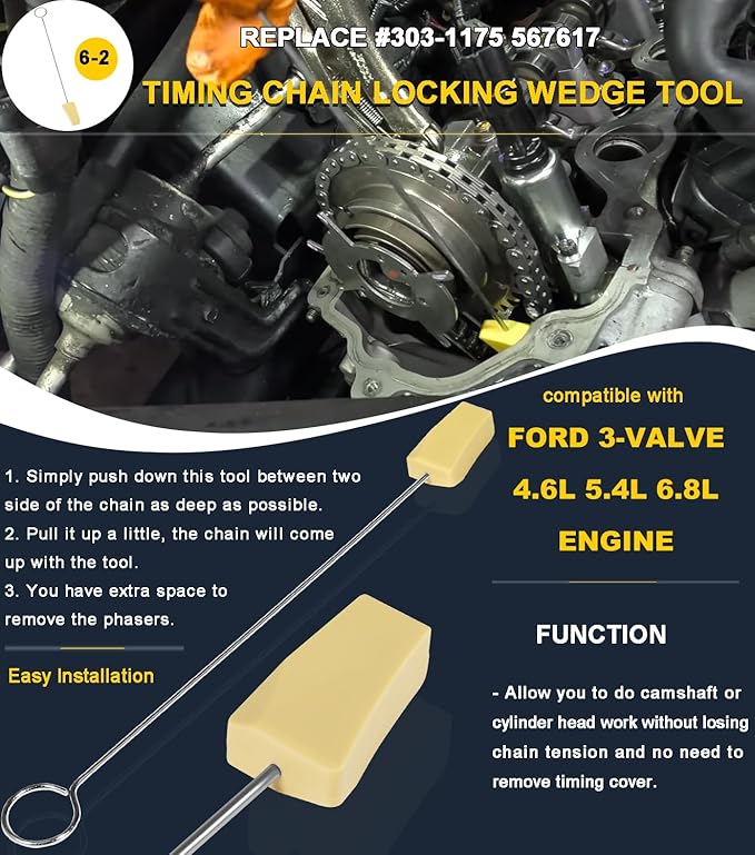 - [ Timing Chain Locking Tool ] -- Fits for Ford 4.6L 3V, 5.4L 3V. Replace# 303-1175 567617. Simply push down this tool between two side of the chain as deep as possible till it lock into position, then pull it up a little, the chain will come up with the tool, and you have extra space to remove the phasers. Allow you to do camshaft or cylinder head work without losing chain tension and no need to remove timing cover.