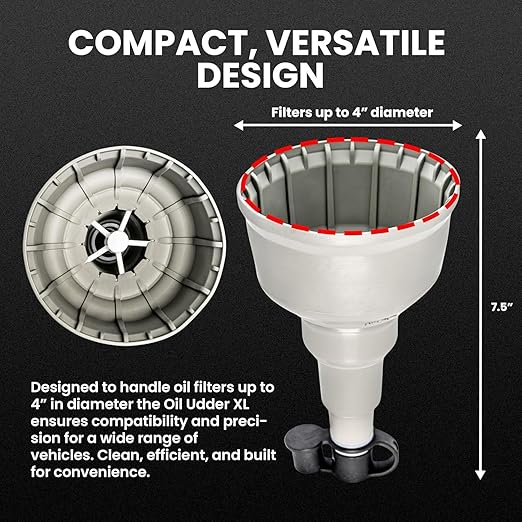 - USED OIL FILTER REMOVAL AID – Acts as a reliable oil filter funnel and oil catch when changing automotive fluids. Compatible with various filler tube and oil drain setups, this funnel helps prevent spills and mess during oil changes on cars, trucks, RVs, or other large engine vehicles.