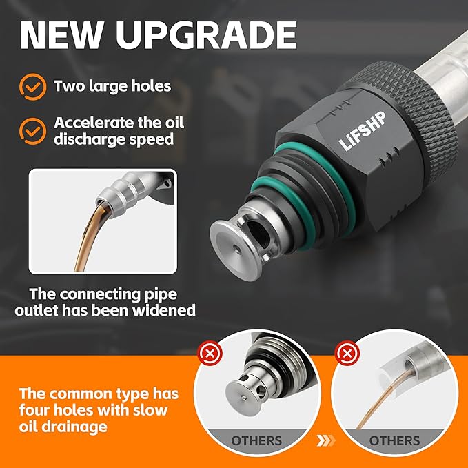 - PRODUCT DESIGN :The oil drain pipe has a newly upgraded large 2-hole efficient oil drain design, which is faster than the traditional 4-hole oil drain, Double O-ring seal to prevent oil leakage