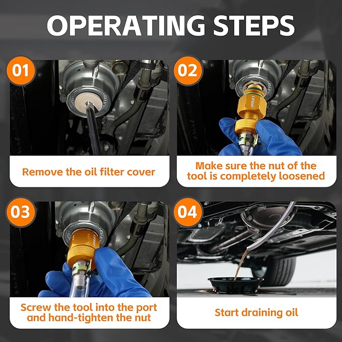 - INSTRUCTIONS:you simply remove the drain plug of the oil filter housing and screw in the tool in the closed position, and then turn the wheel to the open the valve to let the oil drain out. When the oil finishes draining, turn the wheel again to close the valve, remove the tool, and then proceed to remove the oil filter housing as normal.