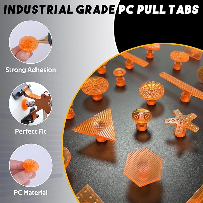 - đ PAINTLESS DENT REPAIR KIT: The Super PDR paintless dent repair kit is easy to understand and use. Made of high-grade alloy, the main tools are durable and simple to use, making it easy for even beginners to master. It also comes with all the puller tabs needed to repair dents of any size or shape, making it easy to remove any type of dent. It also protects the original paint, saving you time and expensive repair costs.