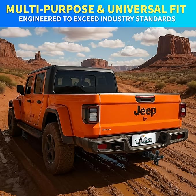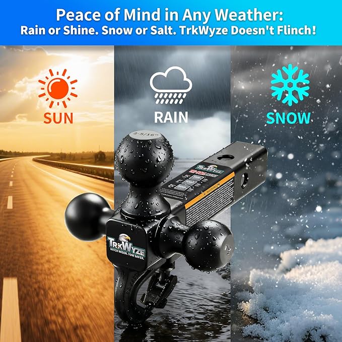 - [SUPERIOR RUST & CORROSION RESISTANCE] Unlike ordinary powder-coated hitches, TrkWyze uses a premium black electropheretic coating on the balls, hook and shank. This advanced finish penetrates deeper into the steel, creating a tougher barrier against rust, corrosion, rain, snow, and road salt. Your hitch stays looking new and performing strong, long after others' finishes chip or peel.