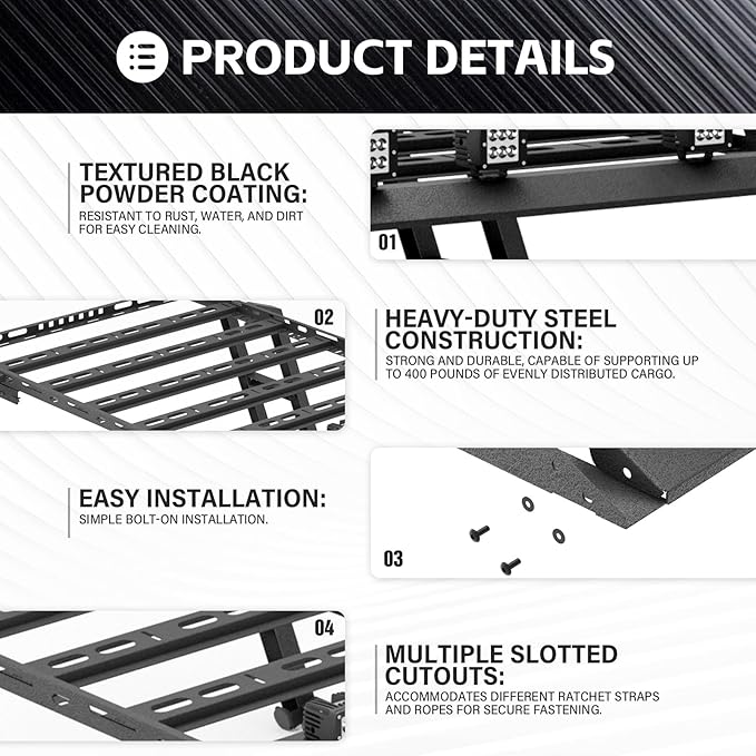 - 【Comprehensive After-Sales Support】: Package Including one set of bed rack, a LED light bar, installation instructions, and mounting hardware. This product comes with a 2-year factory warranty and lifetime customer service support. Our team is available to assist you with any questions or concerns. Feel free to contact us anytime for assistance.