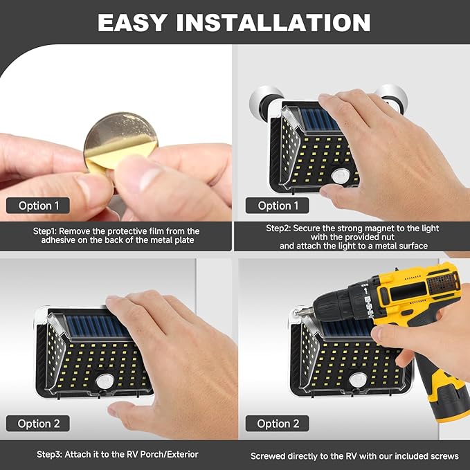 - Effortless No-Drill Installation – Magnetic & Versatile: These Magnetic RV Solar Lights feature upgraded heavy-duty magnets for a secure, no-drill setup on any metal RV exterior. For non-metal surfaces, we include sturdy metal plates with adhesive to ensure universal compatibility across campers, trailers, and trucks. For those who prefer a permanent installation, screws are also included—giving you flexible mounting options in seconds